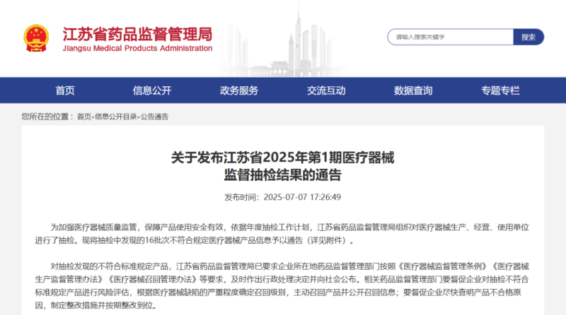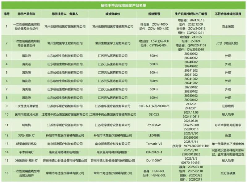 近日,江蘇省藥監(jiān)局發(fā)布《江蘇省2025年第1期醫(yī)療器械監(jiān)督抽檢結(jié)果的通告》,共通告了一次性使用直線切割吻合器及吻合組件、一次性使用鼻氧管、制氧機(jī)、聽覺康復(fù)訓(xùn)練儀等16批次不符合規(guī)定醫(yī)療器械產(chǎn)品,具體明細(xì)如下: