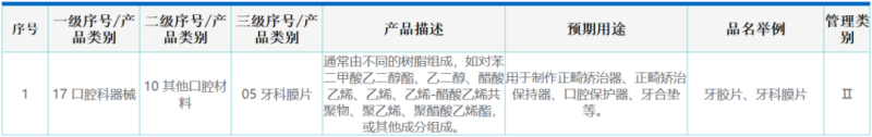 我們通過查看本次獲證產品的“結構及組成”可以看到,此類產品“由具有醫療器械注冊證的牙科膜片經壓制成型后打磨、拋光而成。”因此,牙膠片/牙科膜片是正畸矯治器最為關鍵的一項原材料,可以外購,也可以企業自己生產,但前提是要有注冊證(同樣是Ⅱ類產品,分類編碼17-10-05)。