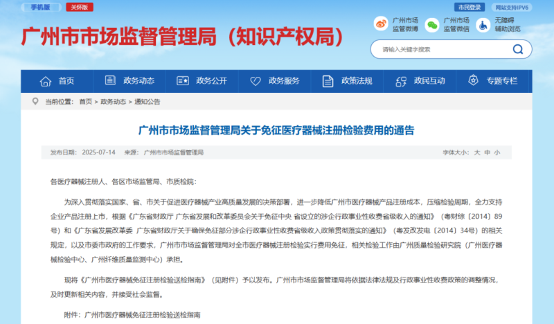 7月14日,廣州市市場監(jiān)督管理局發(fā)布《廣州市醫(yī)療器械免征注冊檢驗送檢指南》(以下簡稱《指南》)對全市醫(yī)療器械注冊檢驗實行費用免征,相關(guān)檢驗工作由廣州質(zhì)量檢驗研究院(廣州醫(yī)療器械檢驗中心、廣州纖維質(zhì)量監(jiān)測中心)承擔(dān)。