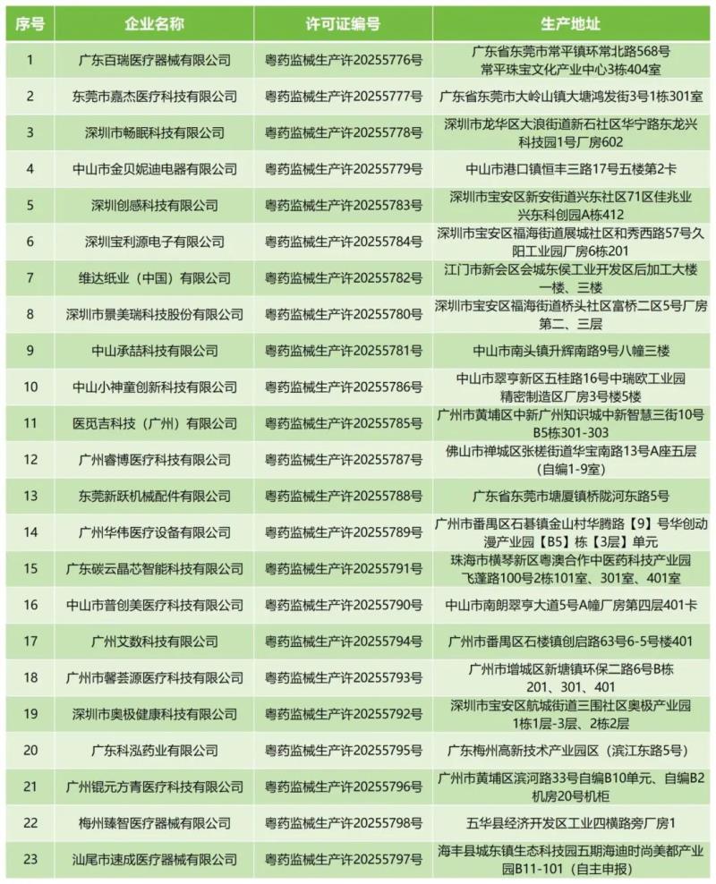 近日,廣東省藥監局公布了《2025年6月醫療器械生產許可證核發清單》,據該公開數據顯示,2025年6月,廣東百瑞醫療器械有限公司、深圳市暢眠科技有限公司、維達紙業(中國)有限公司、深圳市景美瑞科技股份有限公司等共計23家企業新拿到了醫療器械生產許可證,具體明細如下: