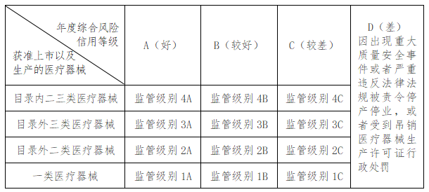 第六條 根據本市醫療器械生產企業年度綜合風險信用評定情況(評定指標詳見附件,市藥品監管局可結合監管實際適時調整評定指標),將企業劃分為A、B、C、D四個等級。