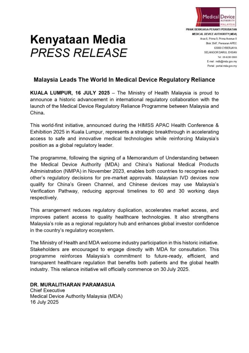 近日,馬來(lái)西亞MDA推出了馬來(lái)西亞與中國(guó)之間的醫(yī)療器械監(jiān)管互信計(jì)劃,該計(jì)劃提到,中國(guó)醫(yī)療器械產(chǎn)品憑NMPA認(rèn)證可通過(guò)馬來(lái)西亞“驗(yàn)證通道”(Verification Pathway)30個(gè)工作日極速獲批,而馬來(lái)西亞IVD產(chǎn)品也可經(jīng)中國(guó)“綠色通道”(Green Channel)60個(gè)工作日準(zhǔn)入中國(guó)市場(chǎng),計(jì)劃將于2025年7月30日正式啟動(dòng)。