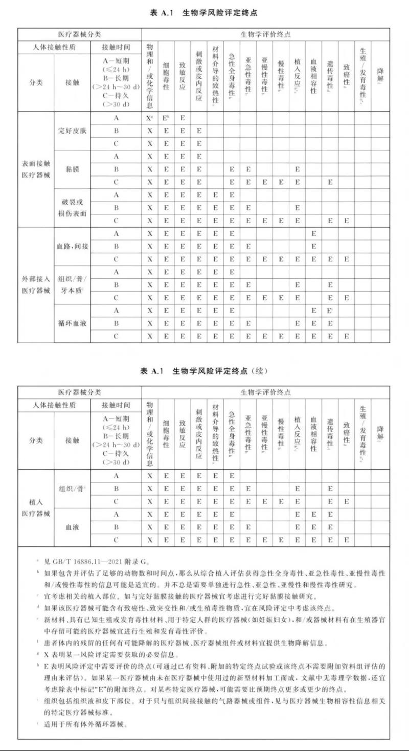 按照上述接觸性質(zhì)和接觸時間2個分類原則確定了醫(yī)療器械類別之后,再根據(jù)標(biāo)準(zhǔn)GB/T 16886.1-2022的附錄A表A.1給醫(yī)療器械找出相對應(yīng)的生物相容性檢驗項目。