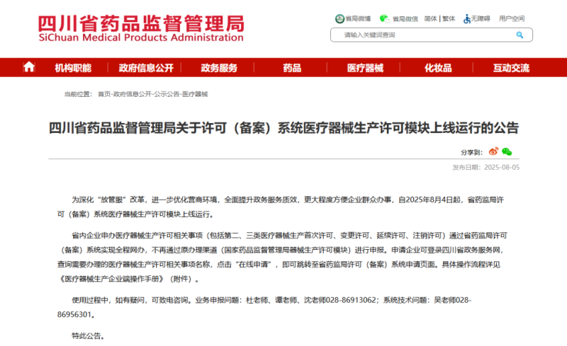 8月4日,四川省藥監局發布《關于許可(備案)系統醫療器械生產許可模塊上線運行的公告》(以下簡稱《公告》),其中提到,自2025年8月4日起,省藥監局許可(備案)系統醫療器械生產許可模塊上線運行。