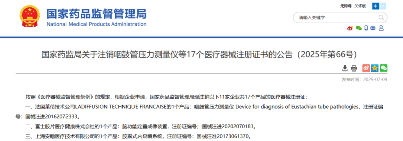 國家藥監局:以下20張醫療器械注冊證已被注銷!