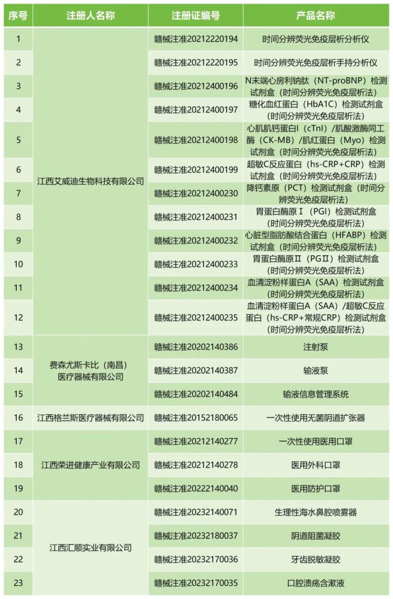 近日,江西省藥監(jiān)局發(fā)布一則醫(yī)療器械注冊(cè)證注銷公告,公告顯示,該局已依法注銷江西艾威迪生物科技有限公司、費(fèi)森尤斯卡比(南昌)醫(yī)療器械有限公司、江西榮進(jìn)健康產(chǎn)業(yè)有限公司5家企業(yè)共計(jì)23個(gè)產(chǎn)品的醫(yī)療器械注冊(cè)證,包括時(shí)間分辨熒光免疫層析分析儀、輸液泵注射泵、牙齒脫敏凝膠等產(chǎn)品,具體明細(xì)如下: