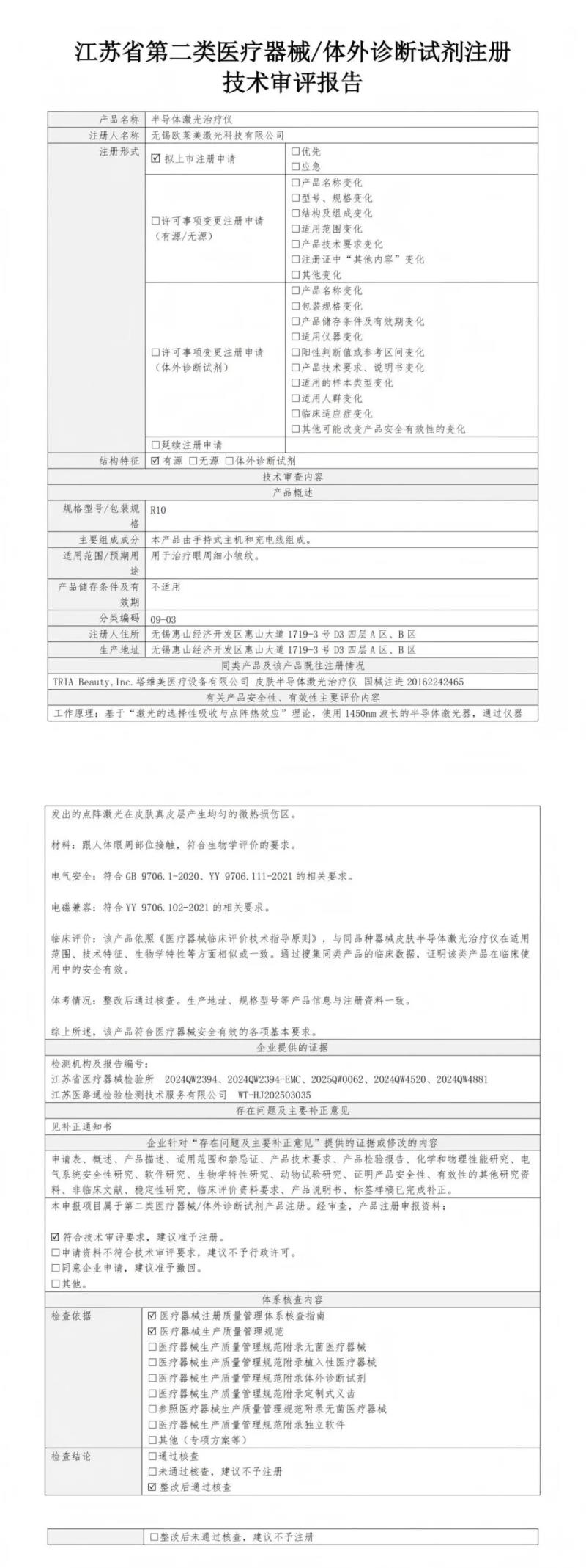 8月12日,江蘇省藥監(jiān)局公布了2025年7月批準(zhǔn)注冊的神經(jīng)肌肉電刺激儀、醫(yī)用分子篩制氧機、半導(dǎo)體激光治療儀、紅藍光治療儀、全自動沖擊波治療儀、醫(yī)用絲素蛋白凝膠敷料、超聲波治療儀、醫(yī)用重組膠原蛋白液體敷料、醫(yī)用壓縮式霧化器、一次性醫(yī)用激光光纖等136個醫(yī)療器械產(chǎn)品目錄,同時隨附了所有產(chǎn)品的技術(shù)審評報告,我們將其中“半導(dǎo)體激光治療儀”(預(yù)期用途:用于治療眼周細小皺紋)的技術(shù)審評報告以圖片形式轉(zhuǎn)載如下: