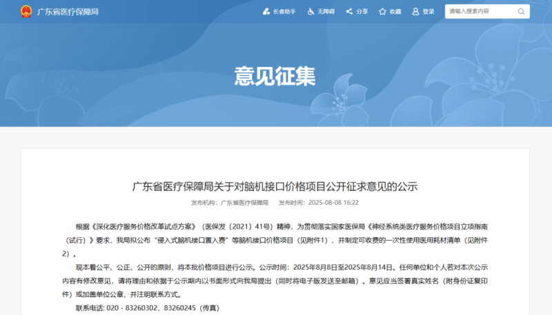 近日,廣東省醫療保障局公布“侵入式腦機接口置入費”等腦機接口價格項目,同時制定可收費的一次性使用醫用耗材清單,并將價格項目進行公示。公示時間:2025年8月8日至2025年8月14日。