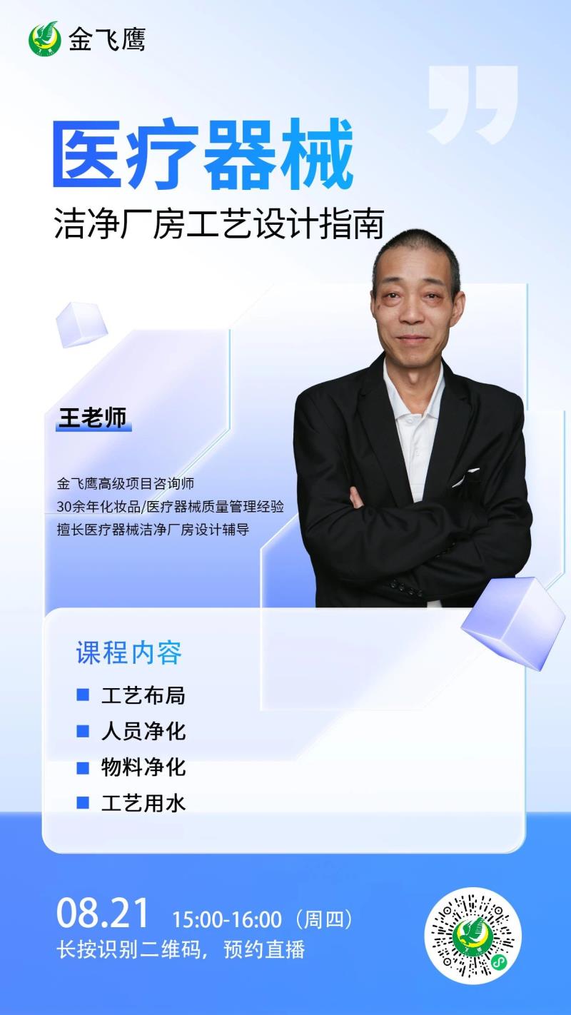 8月21日下午3點(diǎn),金飛鷹高級(jí)項(xiàng)目咨詢師,有著30余年化妝品/醫(yī)療器械質(zhì)量管理經(jīng)驗(yàn),尤為擅長(zhǎng)醫(yī)療器械潔凈廠房設(shè)計(jì)輔導(dǎo)的王老師給大家?guī)?lái)《醫(yī)療器械潔凈廠房工藝設(shè)計(jì)指南》,無(wú)論您是正在規(guī)劃新的生產(chǎn)場(chǎng)地,還是希望提升現(xiàn)有廠房的運(yùn)行效率,都能從課程中獲得專業(yè)指導(dǎo),感興趣的朋友記得提前預(yù)約!