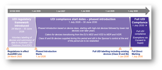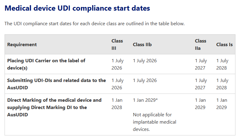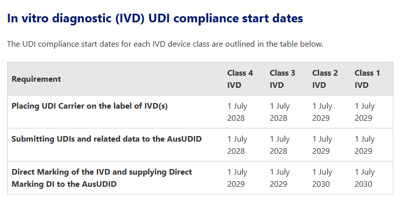 這其中,最早實施UDI的為Ⅲ類及Ⅱb類醫療器械,需要在2026年7月1日起將UDI載體放在設備標簽上及向AusUDID 提交 UDI-DI 和相關數據,最晚的則是1類和2類IVD,需要在2030年1月1日完成有關UDI的所有操作。