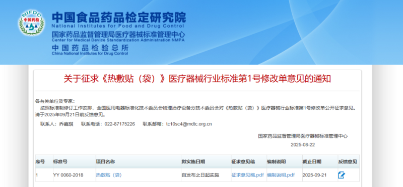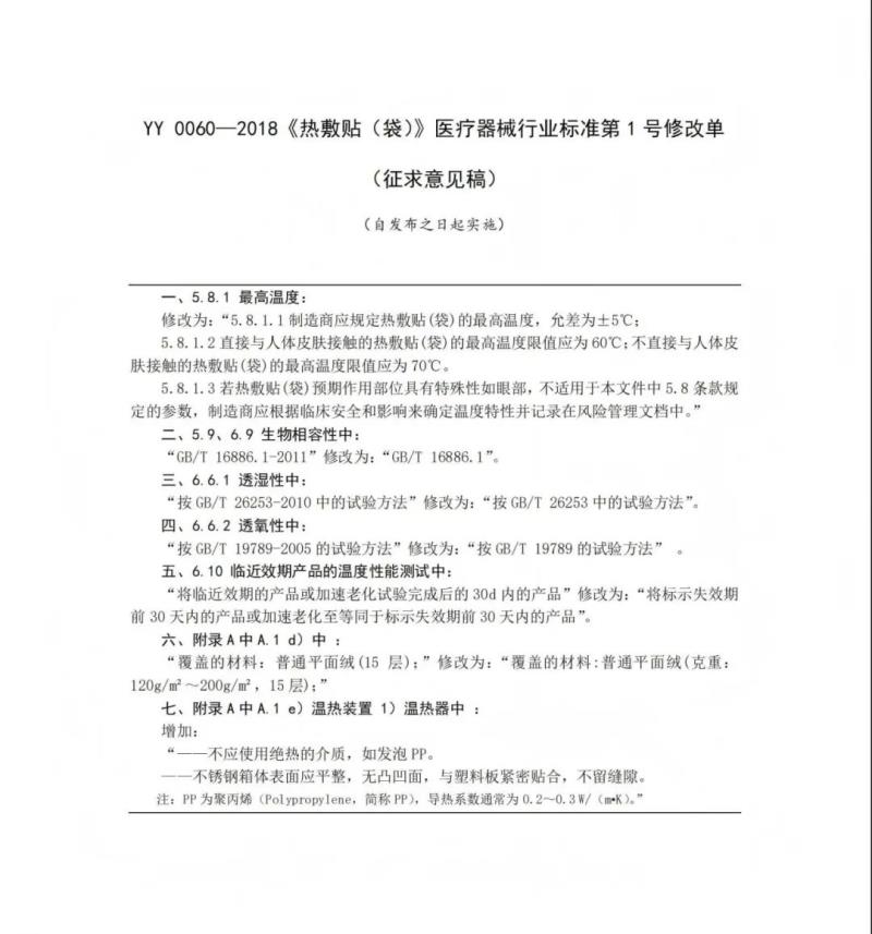 近日,國家藥監局醫療器械標管中心發布YY 0060-2018《熱敷貼(袋)》醫療器械行業標準第1號修改單,并向社會公開征求意見。