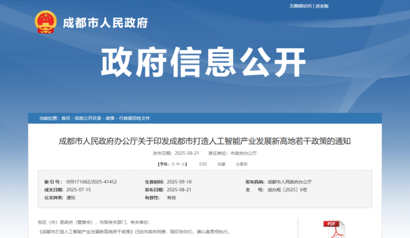 本政策自2025年9月18日起施行,有效期2年,市新經濟委等4部門《關于印發〈成都市圍繞超算智算加快算力產業發展的政策措施〉的通知》(成新經濟〔2023〕1號)、市經信局等7部門《關于印發〈成都市進一步促進人工智能產業高質量發展的若干政策措施〉的通知》(成經信發〔2024〕1號)即行廢止。有效期內,若國家法律法規、規章和相關政策發生變化,本政策相關涉及內容從其變化。本政策實施中的具體問題由市經信局市新經濟委牽頭負責解釋。