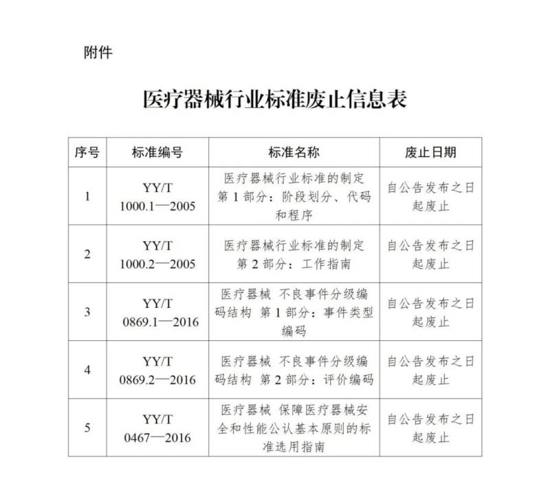 9月1日,國家藥監(jiān)局發(fā)布一則公告稱,該局決定廢止YY/T 1000.1-2005《醫(yī)療器械行業(yè)標準的制定 第1部分:階段劃分、代碼和程序》、YY/T 0869.1-2016《醫(yī)療器械 不良事件分級編碼結(jié)構(gòu) 第1部分:事件類型編碼》等5項醫(yī)療器械行業(yè)標準,具體明細如下: