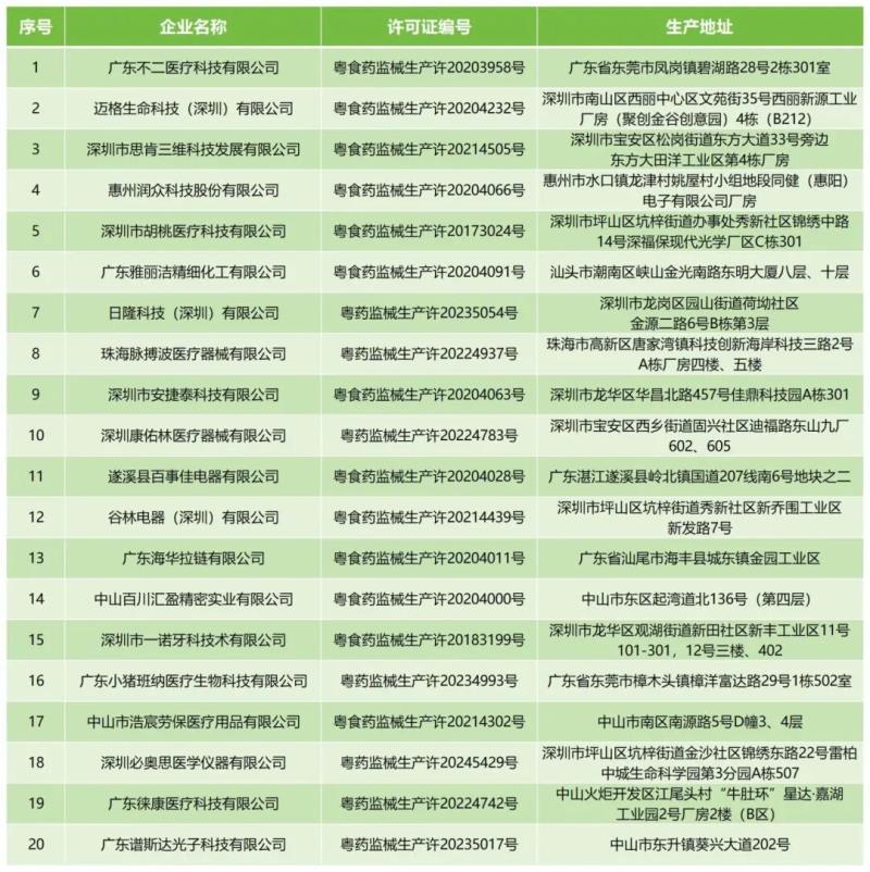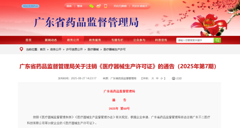 近日,廣東藥監局發布通告稱,按照《醫療器械監督管理條例》《醫療器械生產監督管理辦法》有關規定,根據企業申請,該局已于依法注銷深圳市思肯三維科技發展有限公司、廣東小豬班納醫療生物科技有限公司、廣東徠康醫療科技有限公司等20家企業的《醫療器械生產許可證》,具體明細如下: